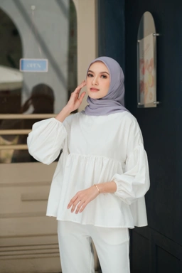 •Features: Model lengan puff dengan kerutan di bagian lengan dan aksen ruffle yang manis